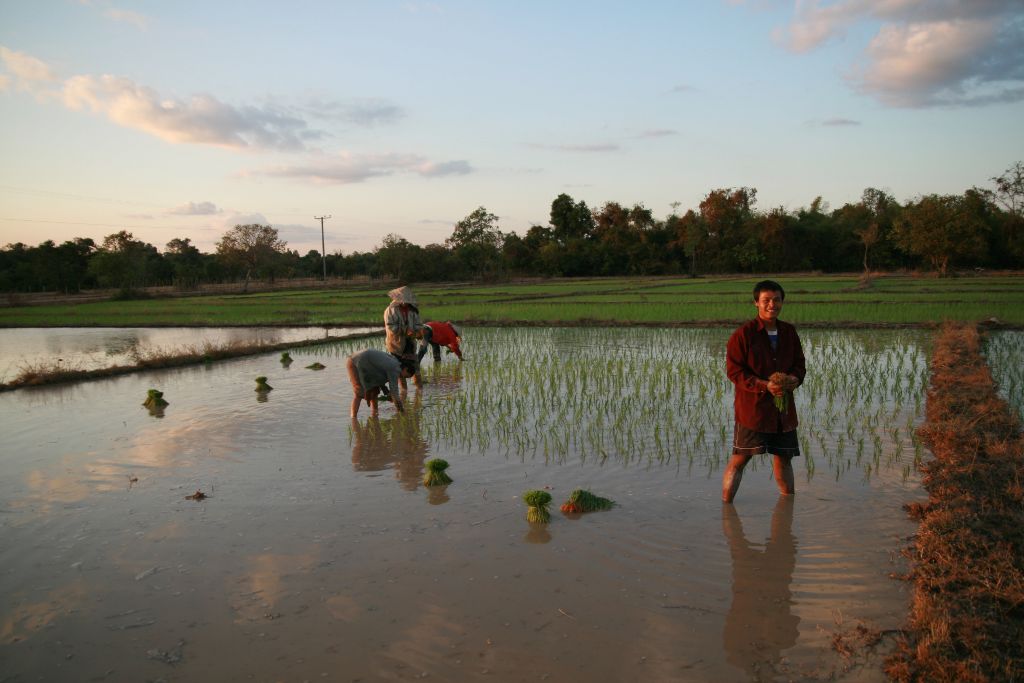A midi, pause pour manger, on mange dans une cantine d’ouvriers au bord du Mékong. J’ai encore la bonne idée d’ajouter trop de piment dans ma soupe et avec la chaleur extérieure plus la tôle qui nous sert de toit, je me liquéfie en moins de trois secondes ! La solution après ça ? Un bon bain dans le Mékong tout habillé ! On se remet sur nos vélos après ce court rafraîchissement et on part pour le Nord de l’île. Il nous reste encore bien 25 bornes à parcourir. Au nord de l’île, superbes paysages sauvages avec des buffles qui se détendent dans le Mékong. Il est 16h30, on commence à entamer la route du retour. Sur la route, des gens sont dans les rizières. On s’arrête et je m’approche. Ils m’invitent à participer. Après avoir compris (et m’être fait expliquer en lao et en mimes) qu’ils n’arrachaient pas le riz mais le plantait, je me mets à la tâche. Je planterai pendant trente minutes des poignées de riz, ce qui a le don de bien faire rire les locaux. Le soleil est quasi tombé, on se dépêche de rentrer mais les derniers kilomètres se font dans la nuit noire. Restaurant de poissons avec cette fois ci un superbe poisson vapeur cuit dans du lait de coco et présenté dans une feuille de bananier, miam !